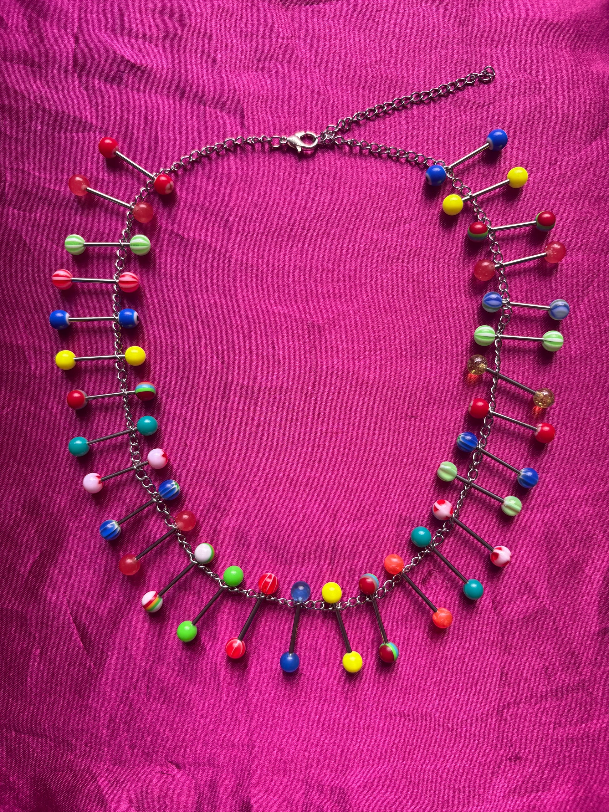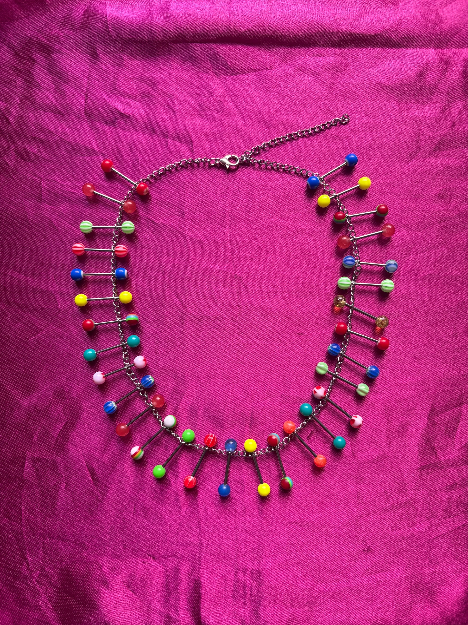 Rainbow piercing necklace with double the amount of usual piercings! Stacked on a sterling silver chain.