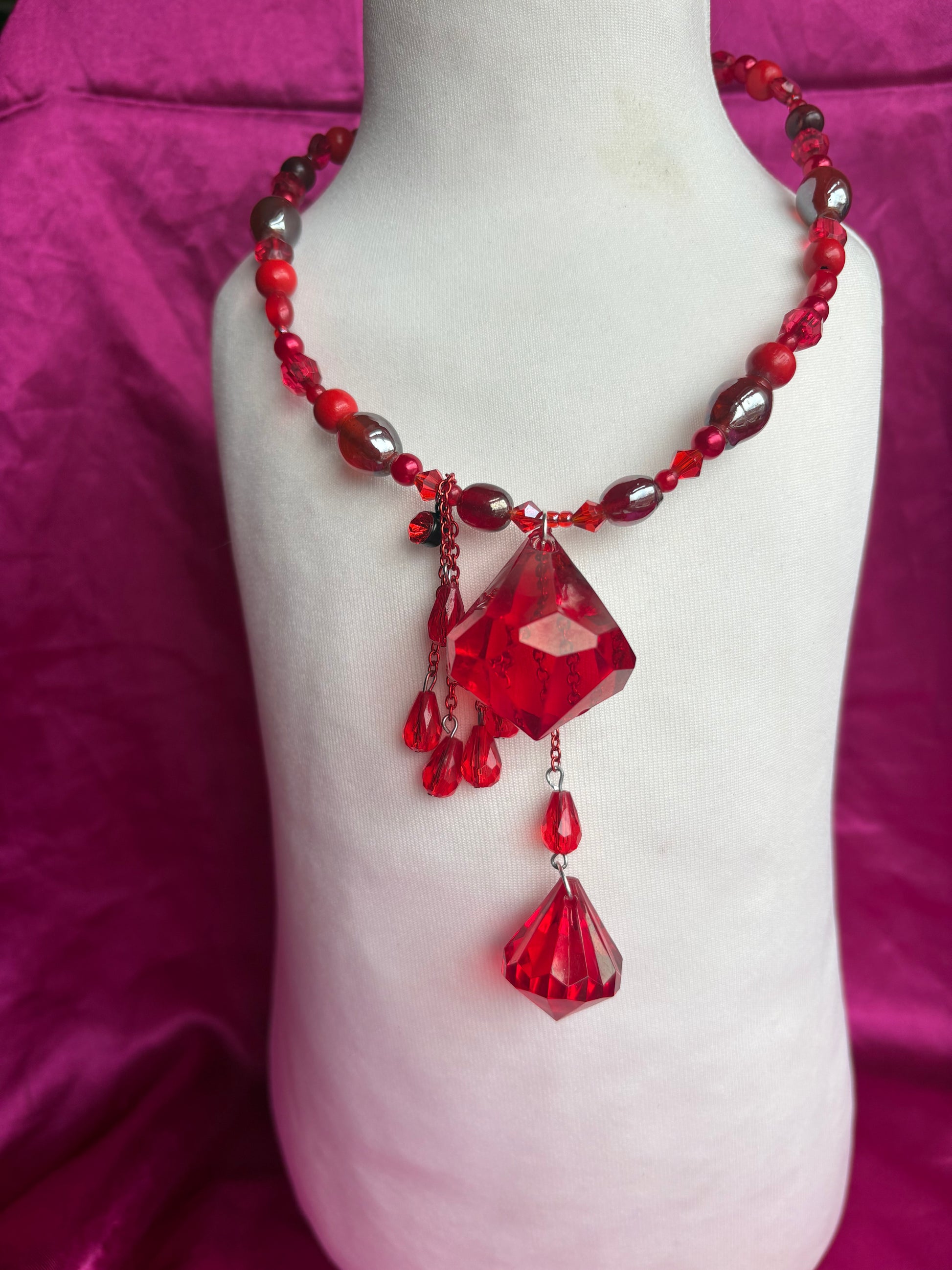 Handmade red beaded choker necklace within unique dangling blood inspired beading.