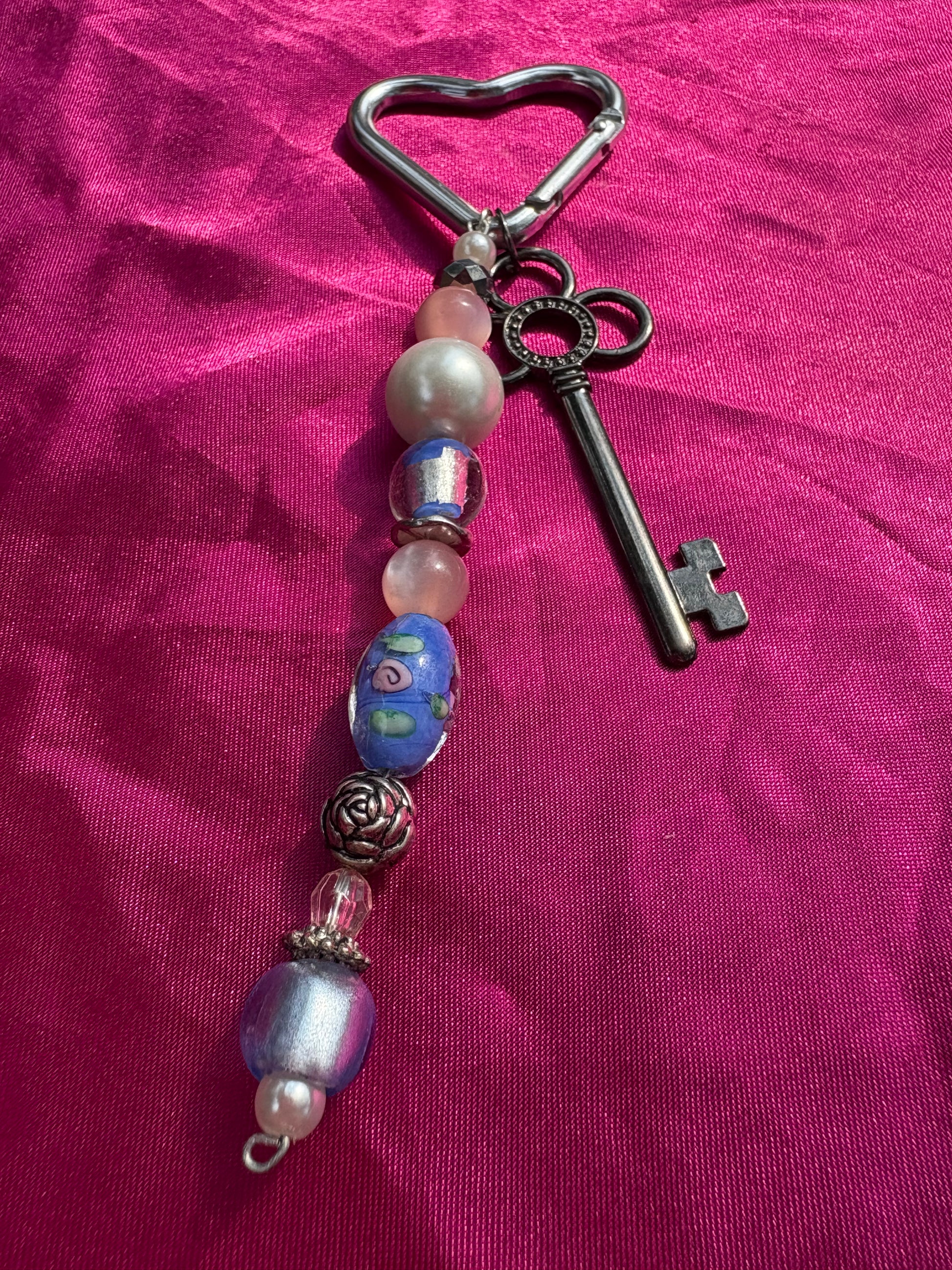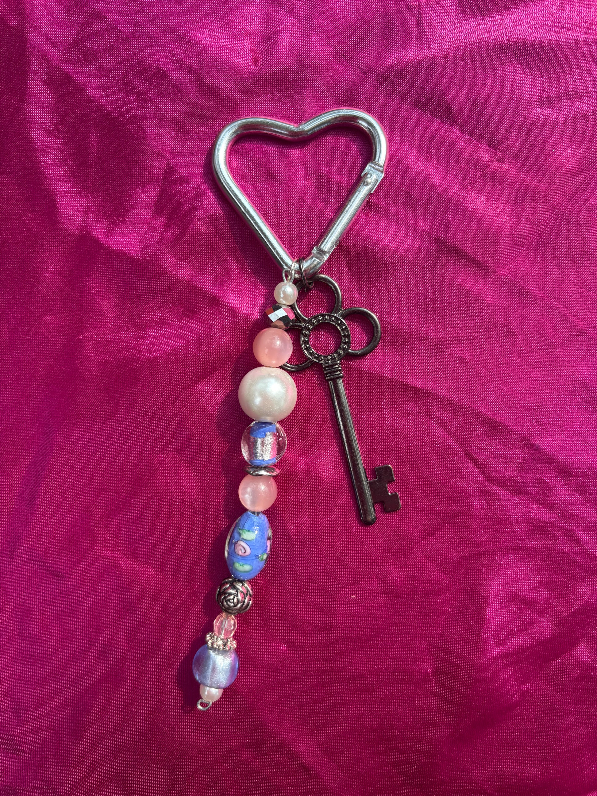 Silver heart carabiner with roses, pink, purple toned beads and large key charm to unlock or lock your lover!