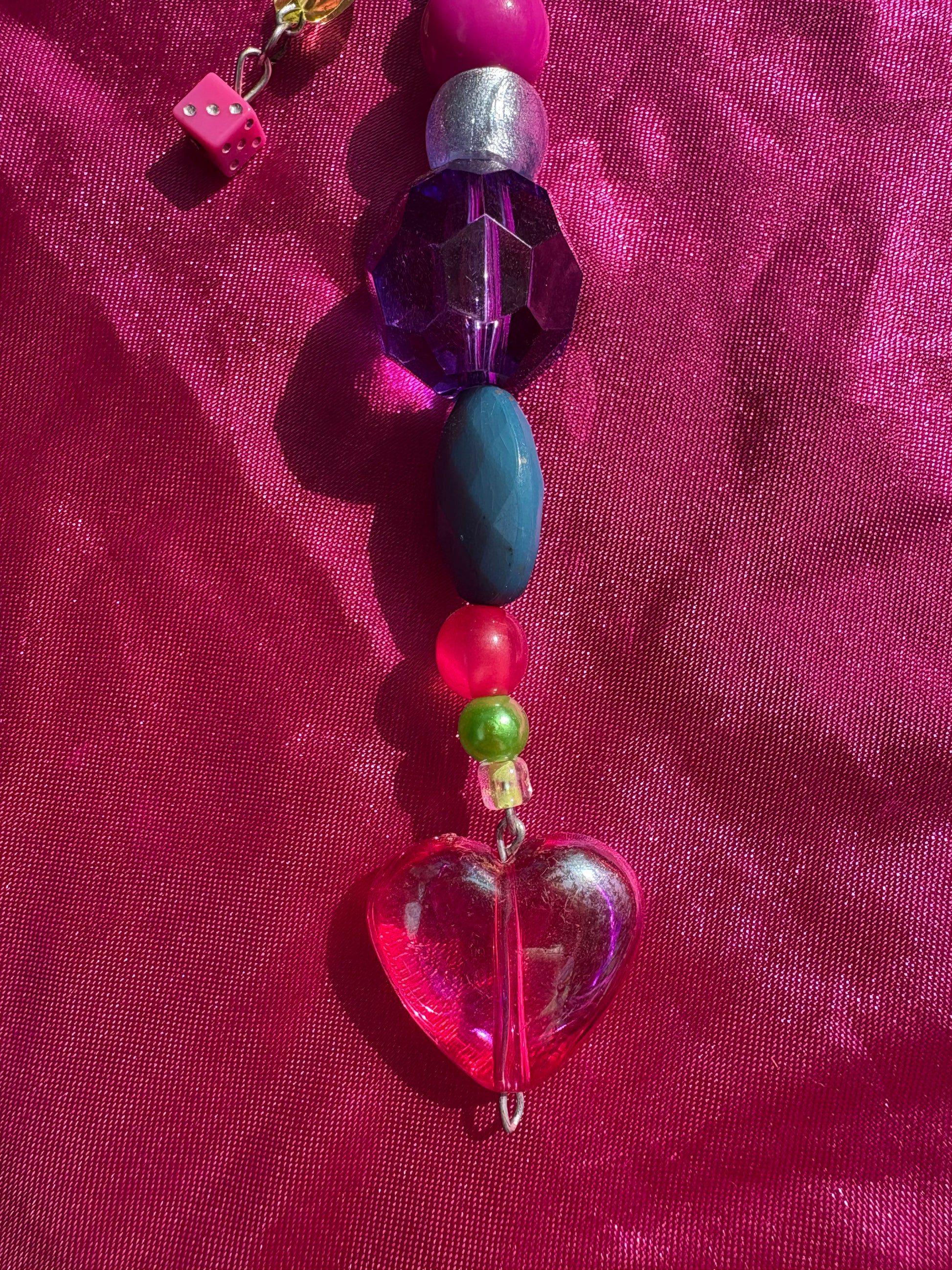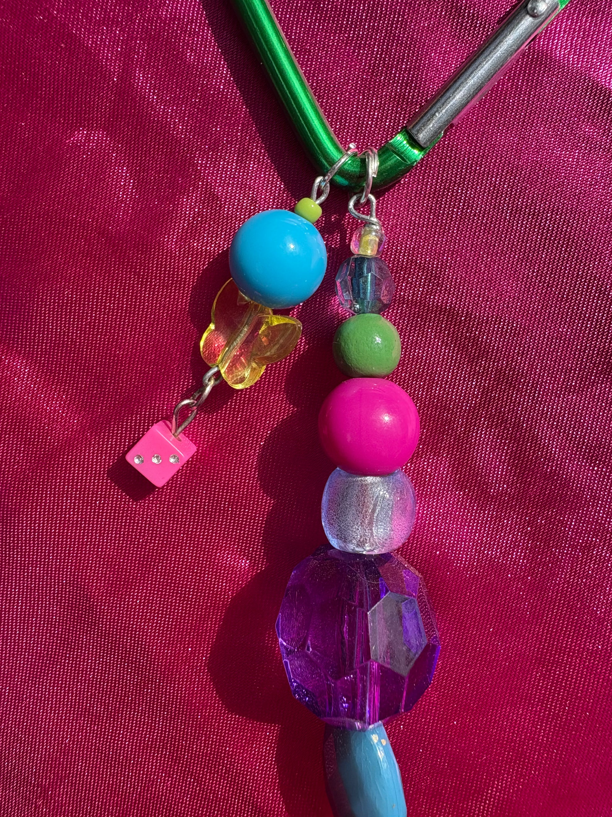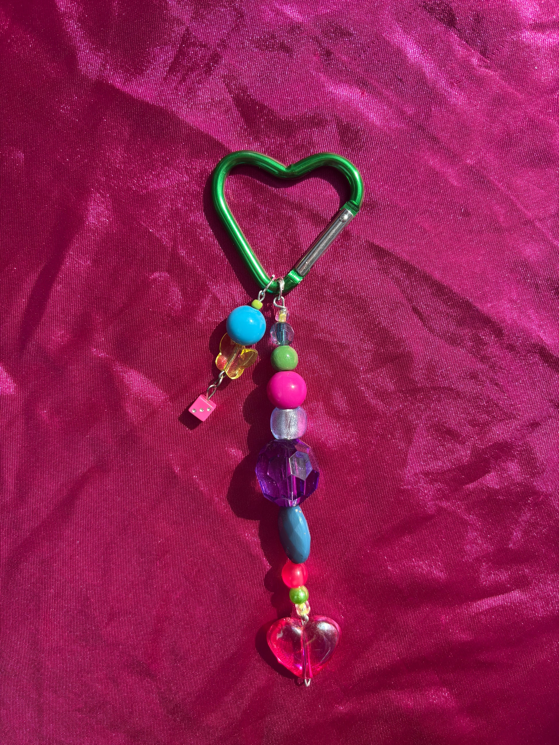 Green heart carabiner with bright multicoloured beads, pink heart and small pink dice charm.