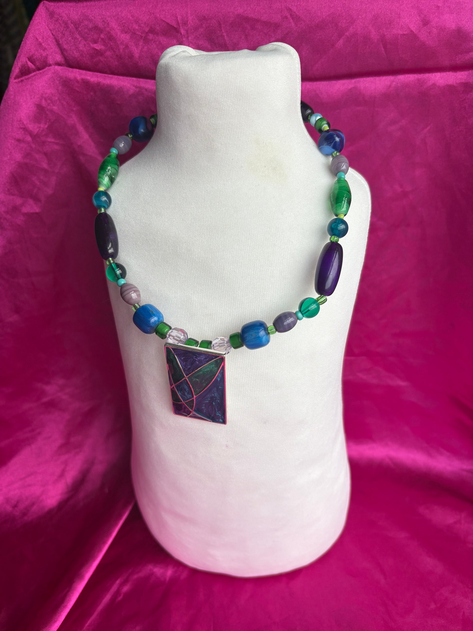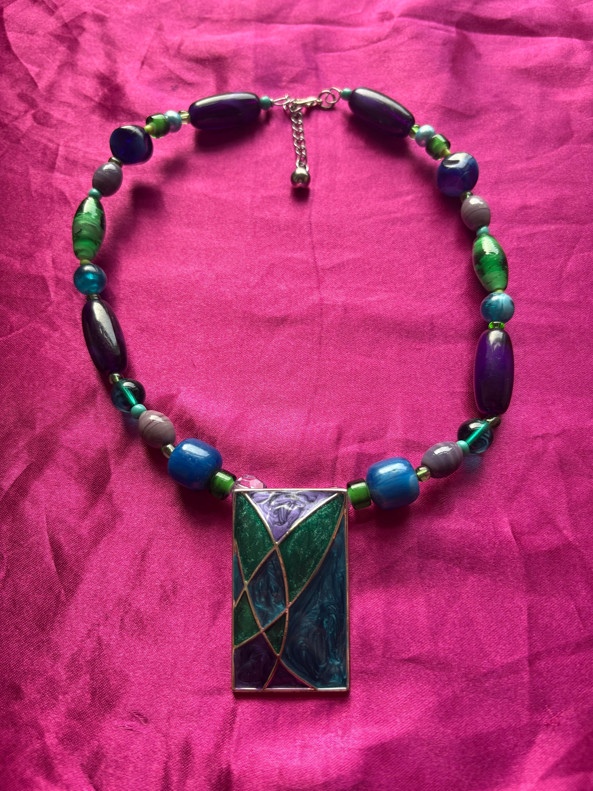 Handmade green, purple, and blue beaded necklace within unique mosaic rectangle pendant.