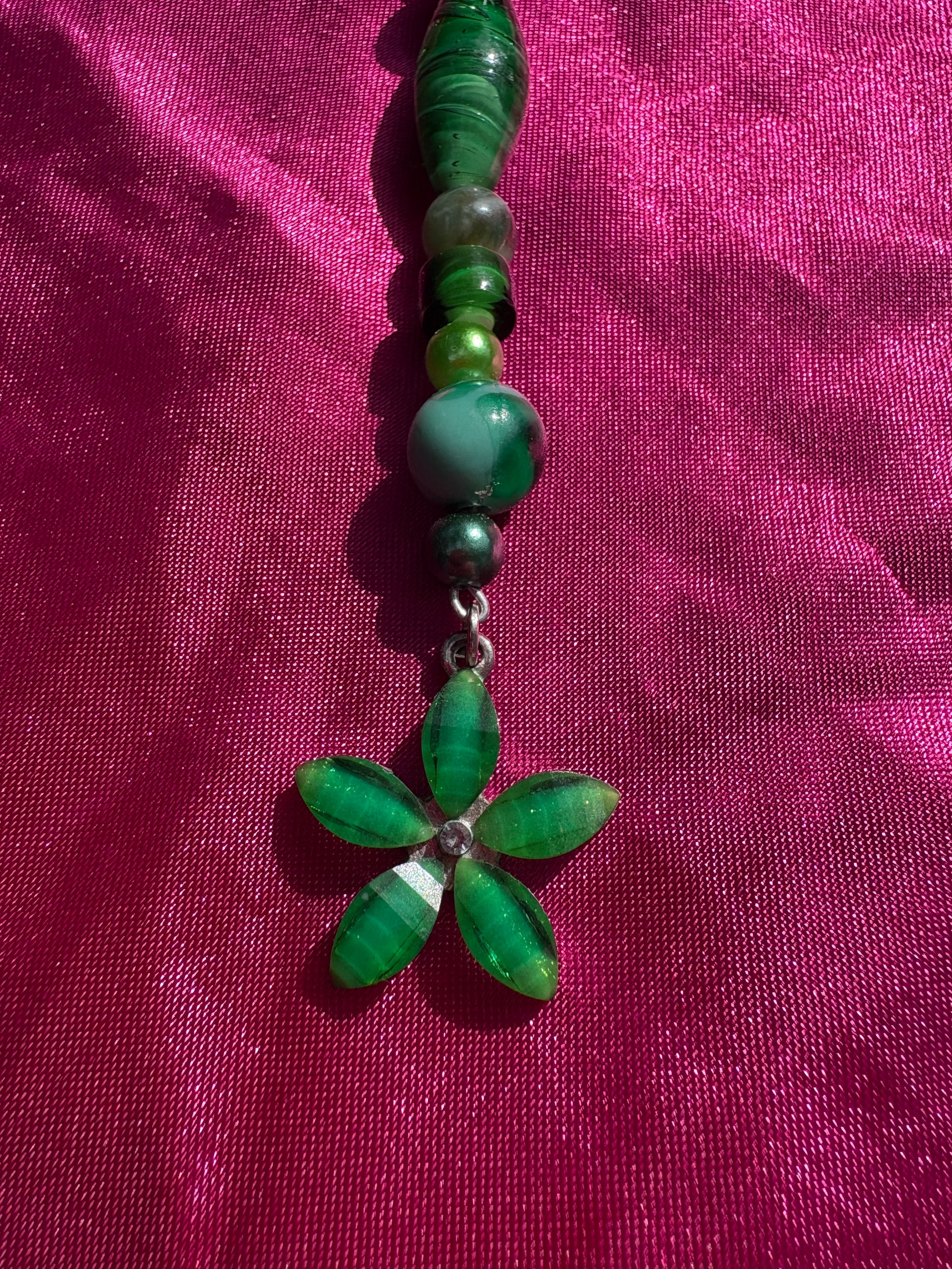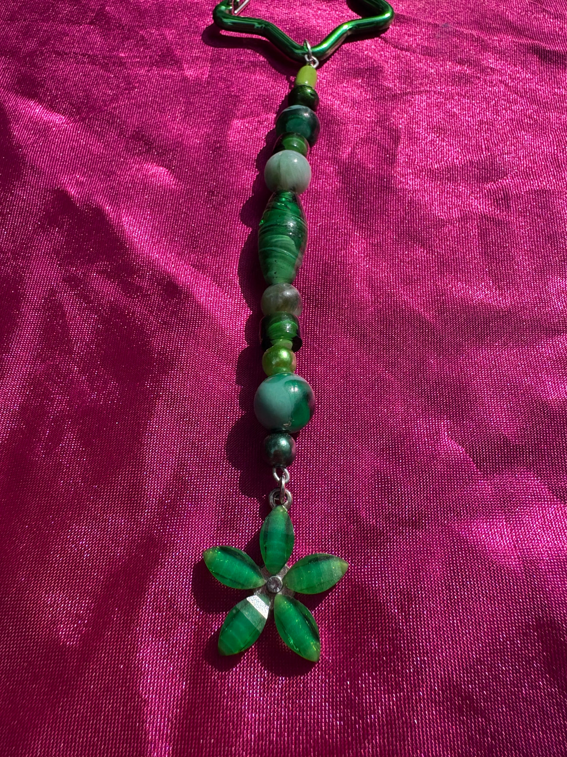 Green star carabiner with striking glass green flower charm and mixed green beads to match.