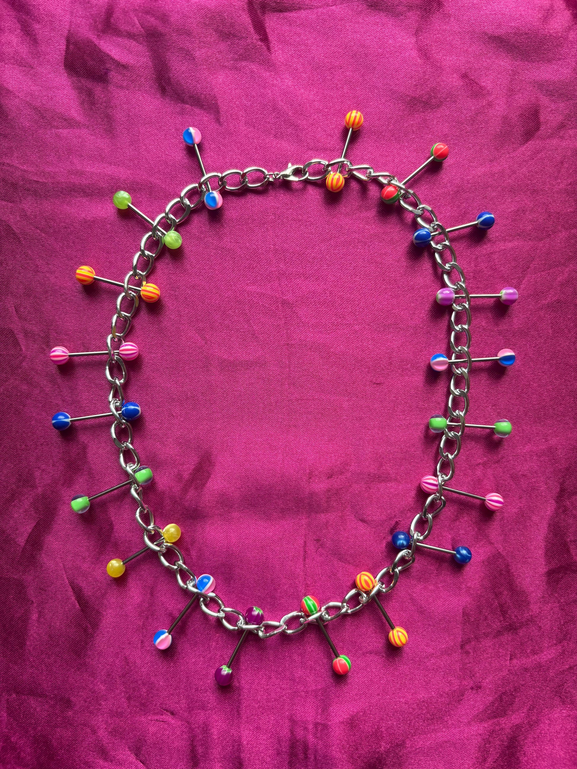 Rainbow neon piercing necklace with sterling silver thick chain.
