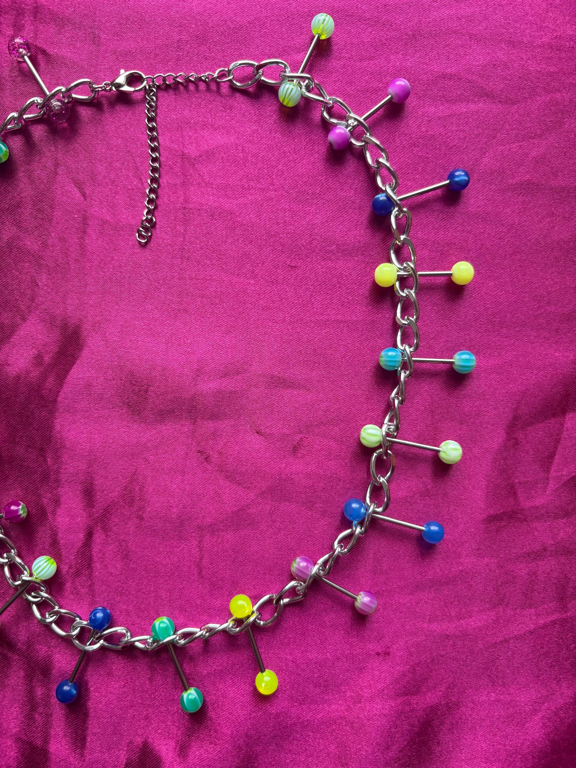 Neon yellow, green, blue, and purple piercing necklace on a sterling silver chain.